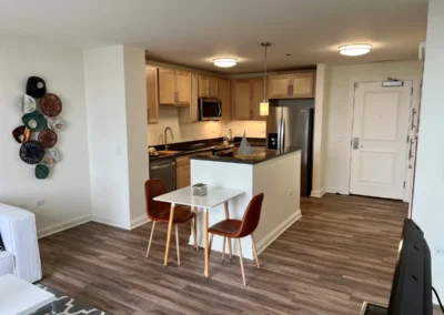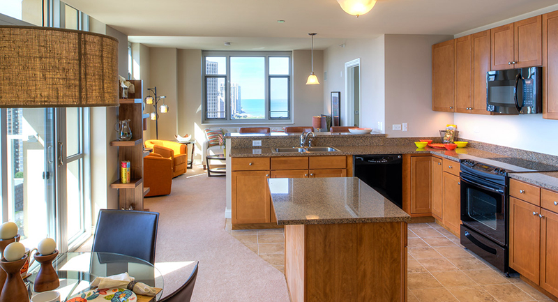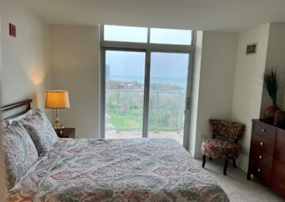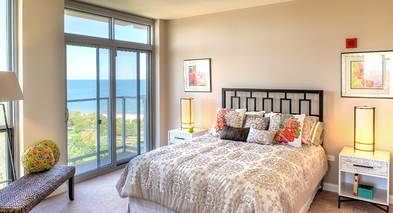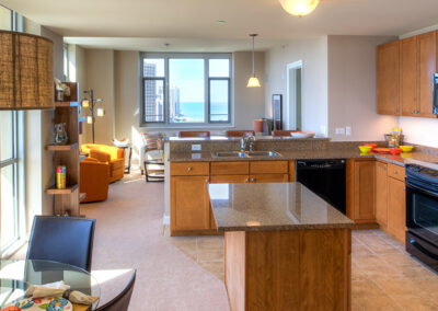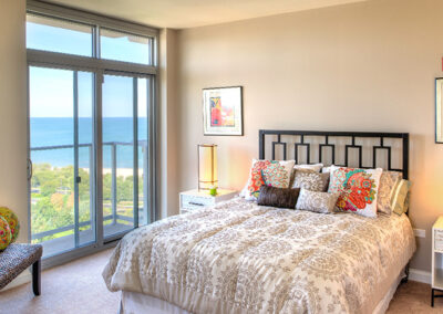 The Dearborn offers beautiful lake and park views through expansive windows and a north-facing balcony. This one-bedroom home features a bright primary bedroom with a walk-in closet, an open upgraded kitchen with quartz countertops, stainless steel appliances, and a large island, plus a glass-front shower and in-home washer and dryer.