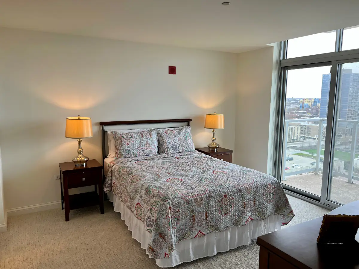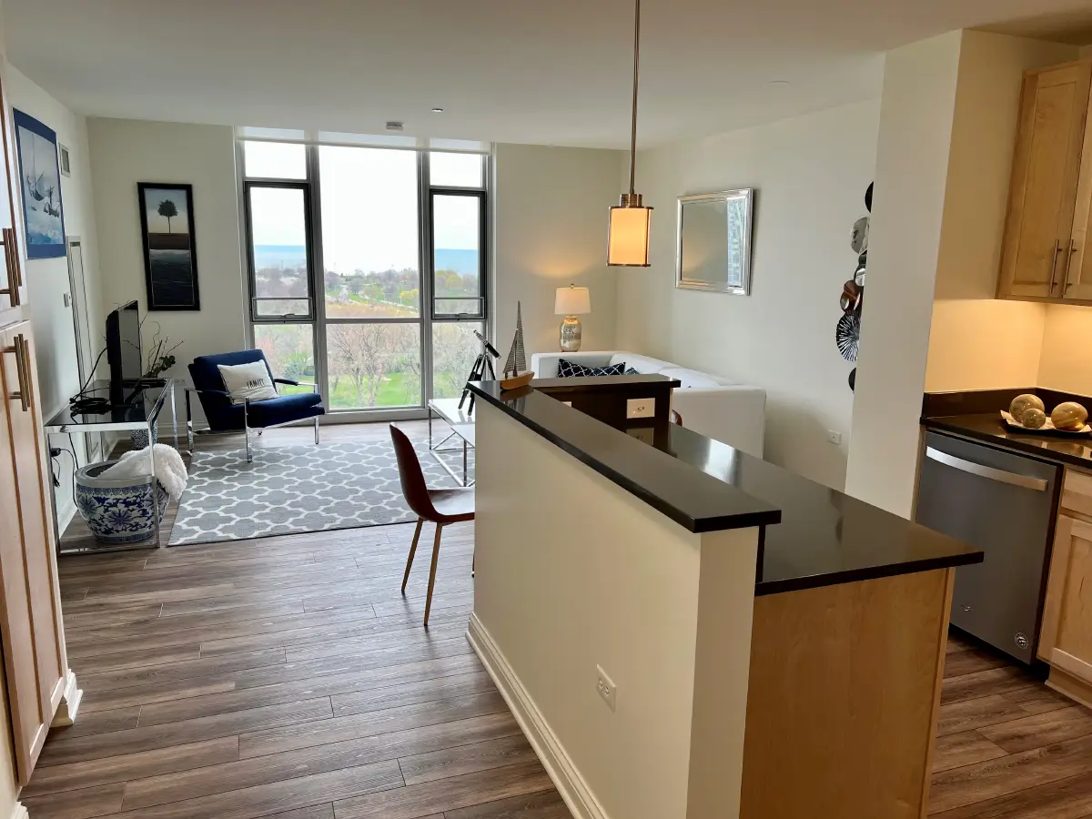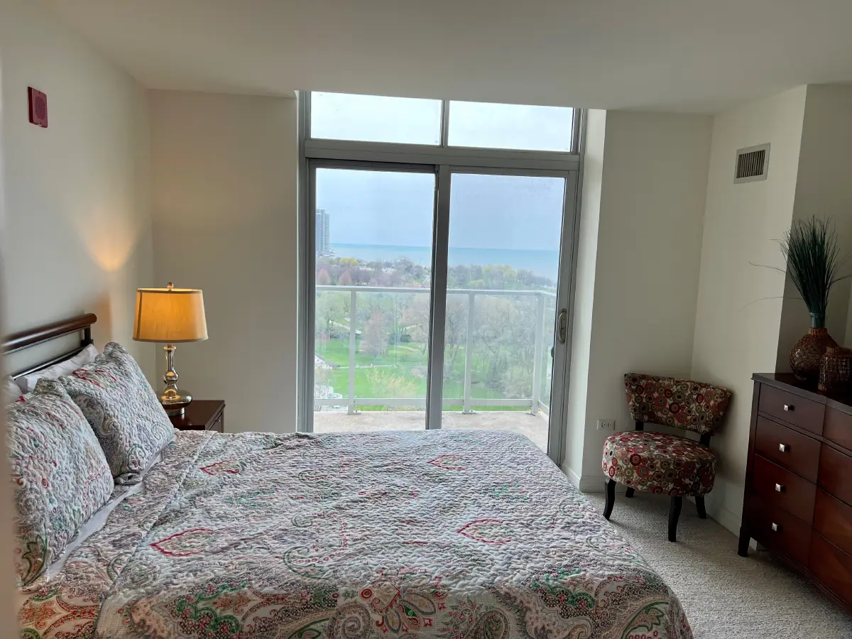 The Sandburg offers expansive lake and city views through large windows and three private balconies. This one-bedroom plus den home features high ceilings, a bright primary bedroom, a unique corner layout with den, and a spacious open kitchen with island, quartz countertops, and stainless steel appliances. A glass-front shower and in-home washer and dryer complete the space, with windows that open for fresh seasonal air.